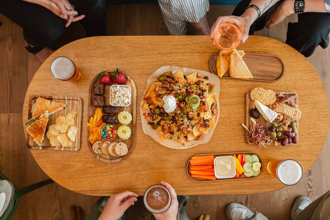 Easy-going, welcoming, bright, fun, community-oriented, with food, pinball, shuffleboard, arcade games, and board games.